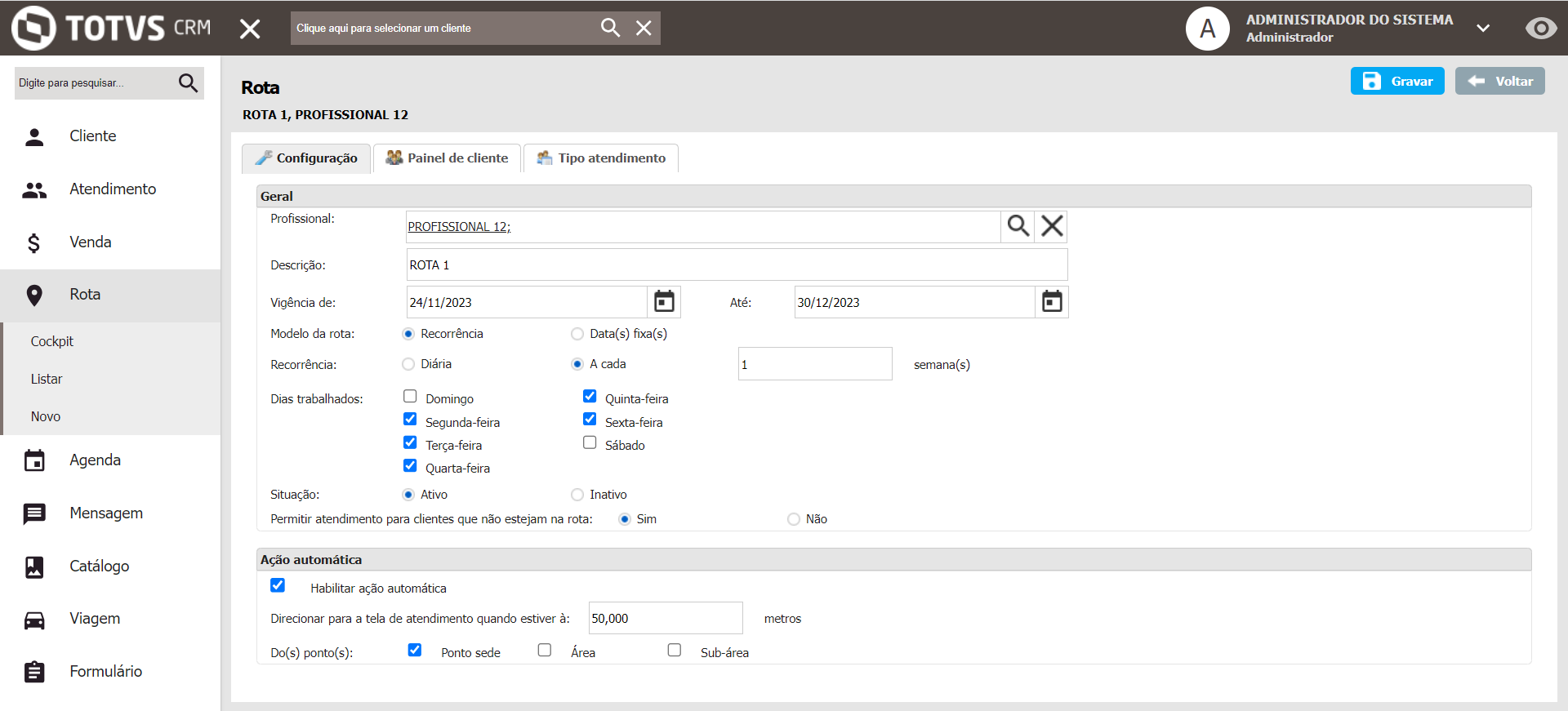 Ao criar uma nova rota, o usuário define o profissional que realizará essa rota, como também define período, dias de atendimento como também as ações que serão realizadas quando o profissional fazer esta visita. Estas configurações estão disponível apenas na WEB.