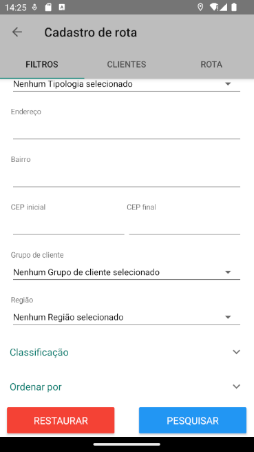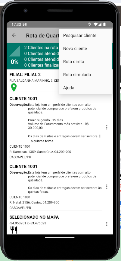 No ambiente Android também é possível adicionar novos clientes em uma rota para o dia, com a opção de filtros para segmentar os clientes na consulta: