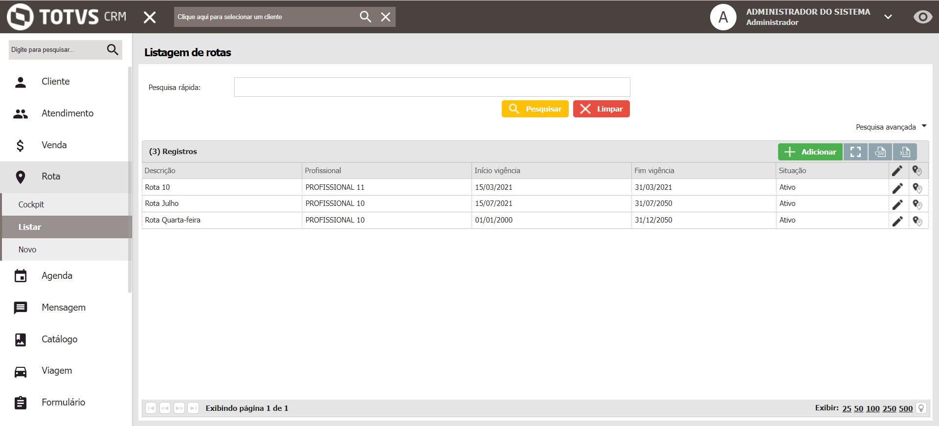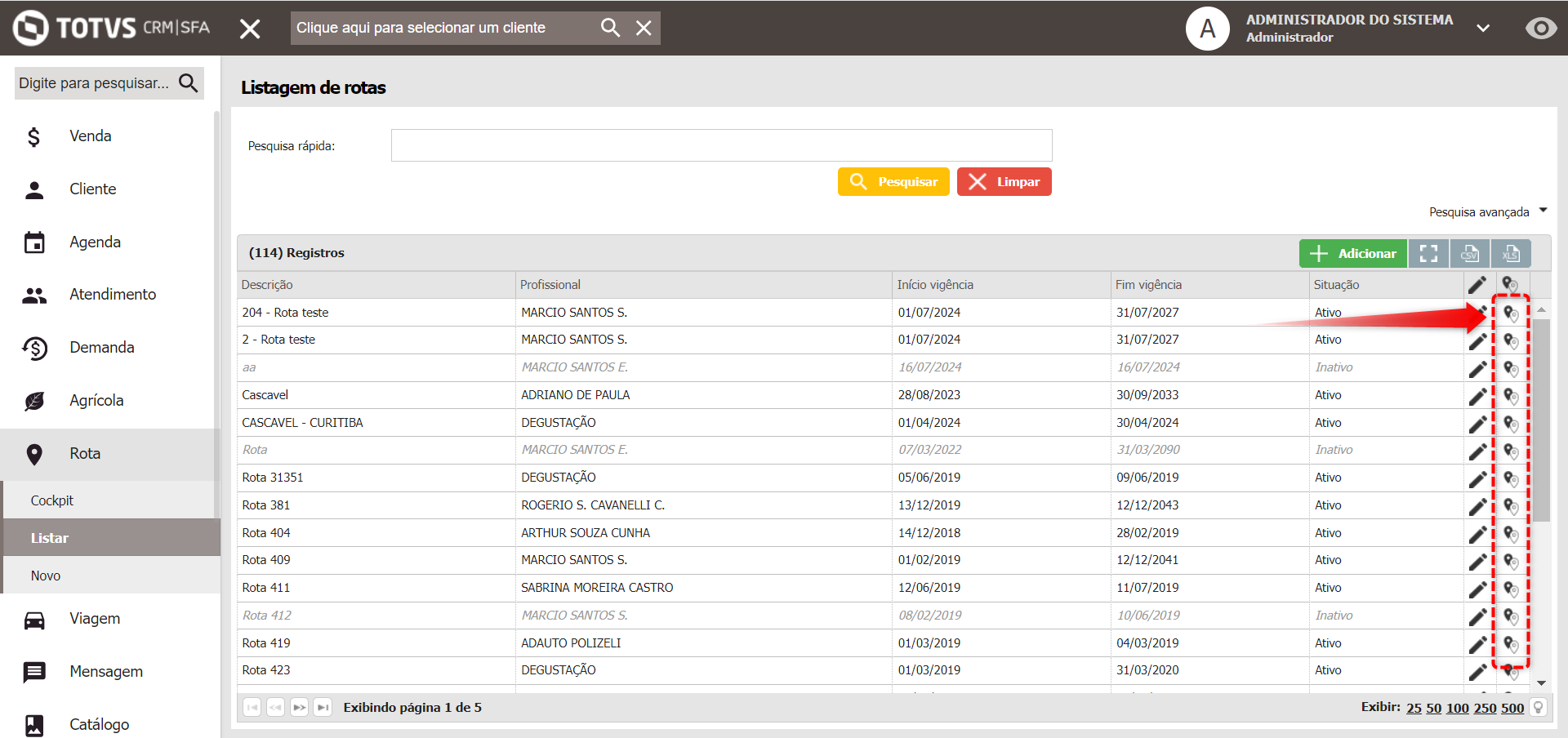 Nesta tela são consultadas as Rotas criadas e editadas. Além de permitir a consulta do Previsto x Realizado pelo ícone de mapa.