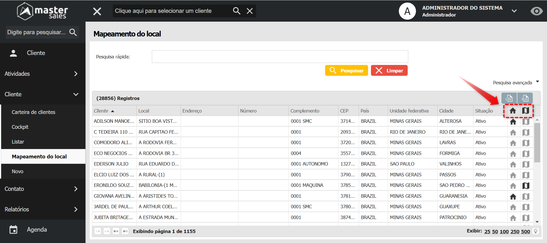 Ao incluir os campos adicionais a coordenada geográfica é exibida na lista ao lado, como é hoje para os clientes.
