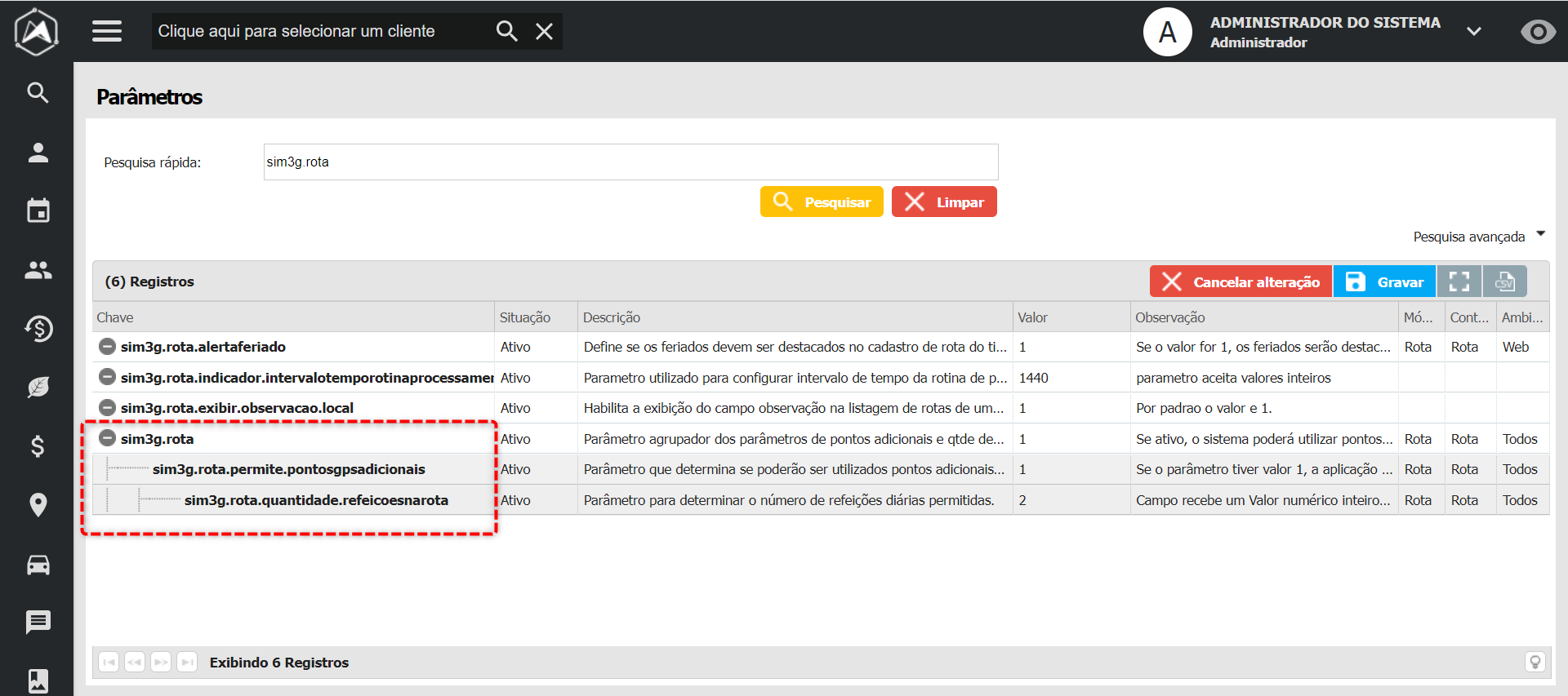 Este botão é exibido se ativado o parâmetro sim3g.rota. Ao ativa-lo, o usuário pode aplicar também as validações dos parâmetros filho: