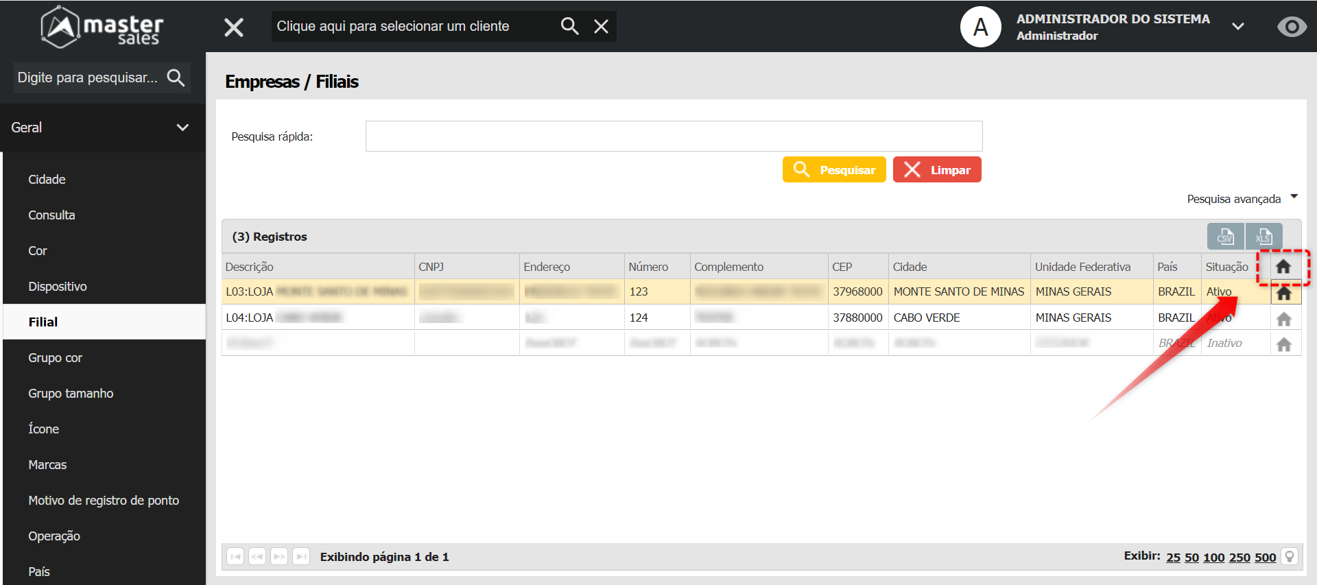 Na grid, são apresentadas as seguintes informações das empresas/filiais:
