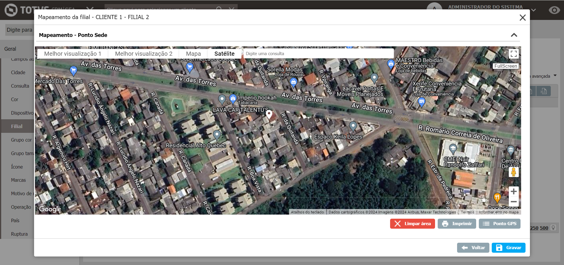 Nessa tela, o usuário pode realizar o cadastro e a edição do Ponto GPS das filiais, o qual será utilizado posteriormente no módulo de rotas.