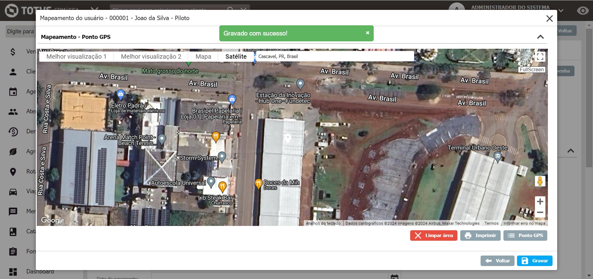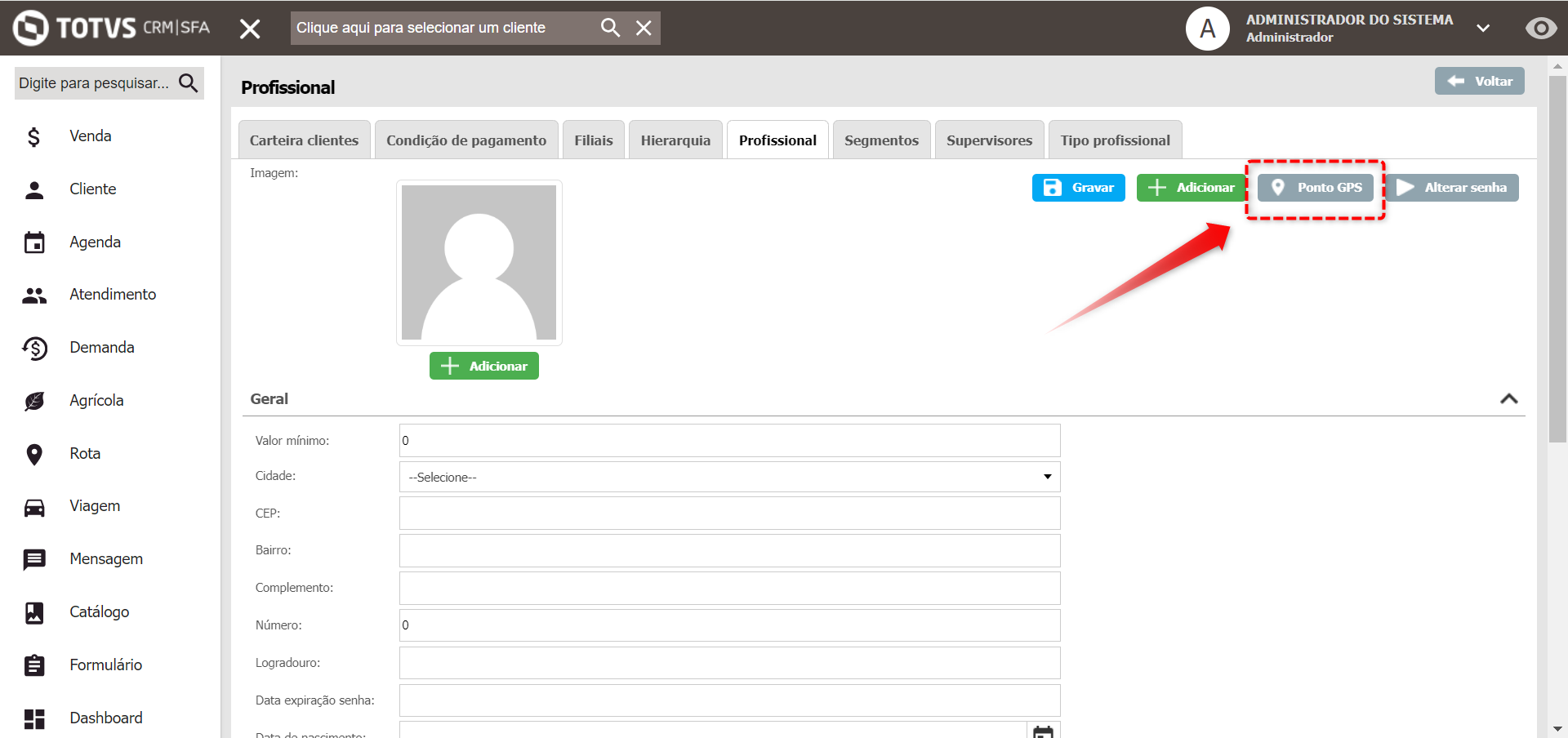 Agora dentro do cadastro do usuário, clique no botão "Ponto GPS"