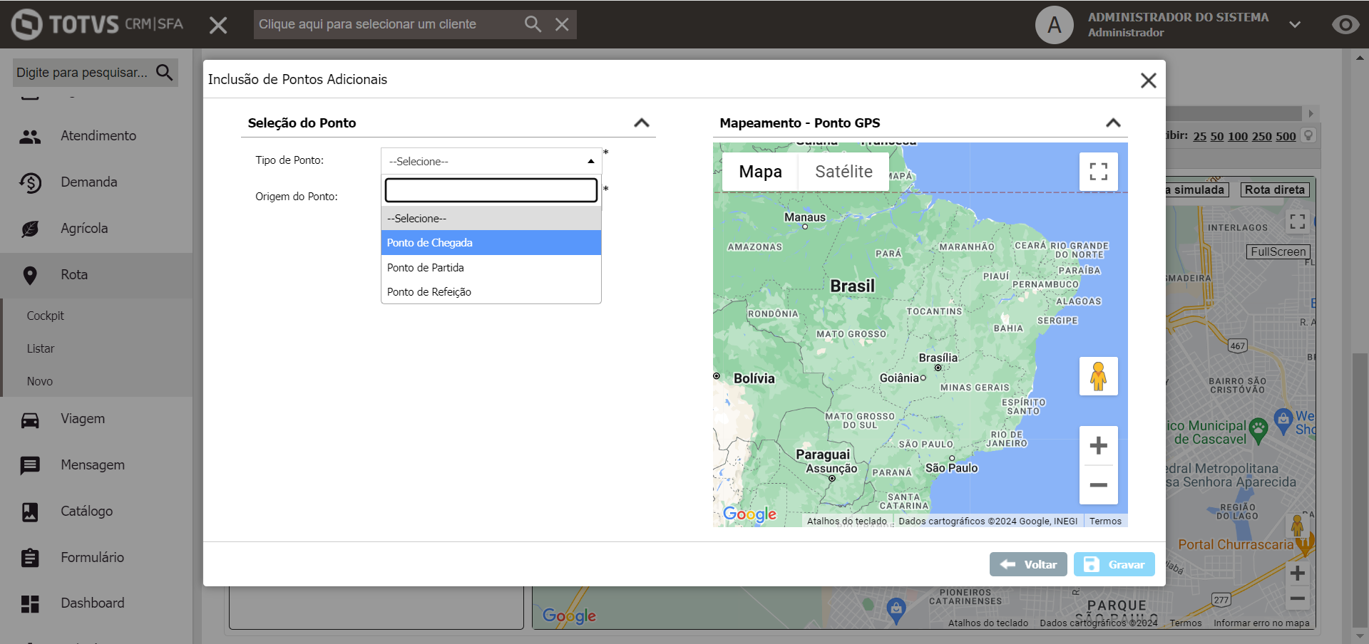 Opção 3 - Escolha de ponto no mapa - Quando selecionado “Selecionado no Mapa” no campo “Origem do ponto”.