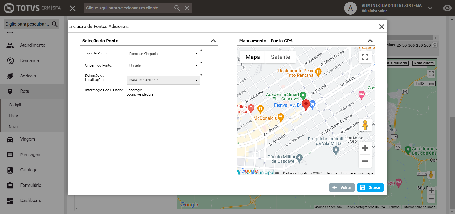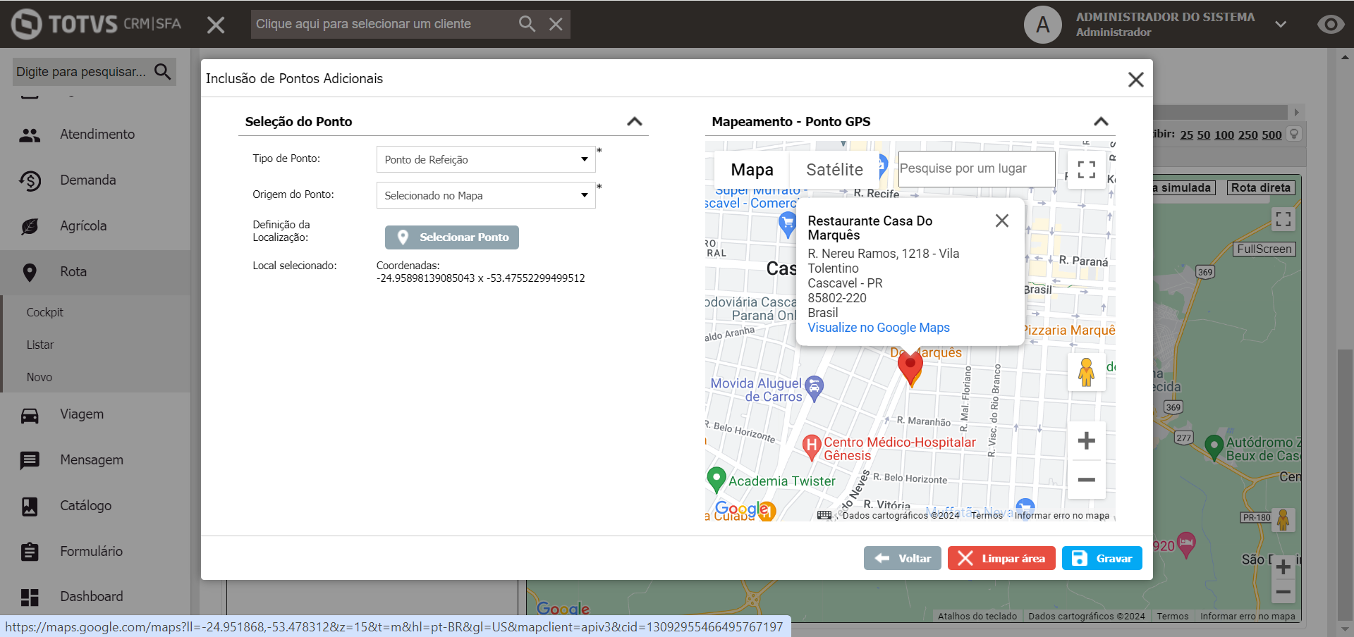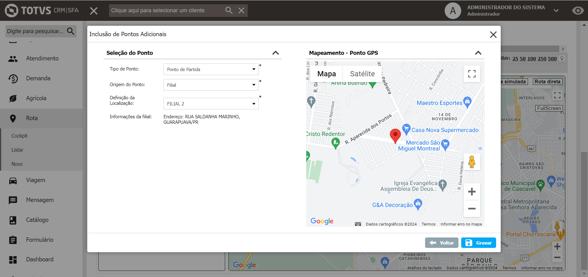 Como exemplo, compondo um Roteiro onde o Ponto de Partida será filial, ao selecionar já é exibido o ponto no mapa e pode ser gravado: