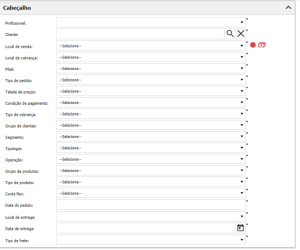 O cabeçalho do pedido é a seção destinada ao preenchimento dos dados comuns e gerais do pedido. Os produtos somente poderão ser adicionados ao pedido após o preenchimento dos campos obrigatórios do cabeçalho. Pelo Configurador de Pedidos, pode-se ativar ou desativar campos, definir títulos, se serão exibidos ou ocultados (e em qual