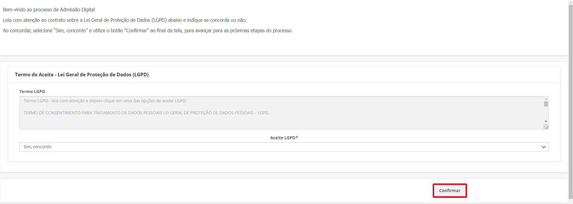 O primeiro contato do colaborador com a ferramenta de admissão é através da etapa de boas vindas, onde ele pode fazer a leitura do Termo LGPD: