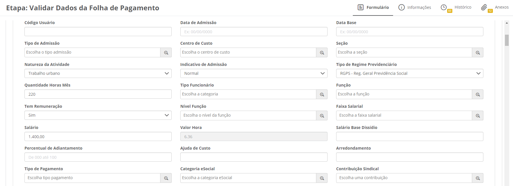 Nessa etapa, o usuário responsável fará o preenchimento de outros dados necessários para a integração com a folha de pagamento, como informações de sindicato, regime previdenciário etc.