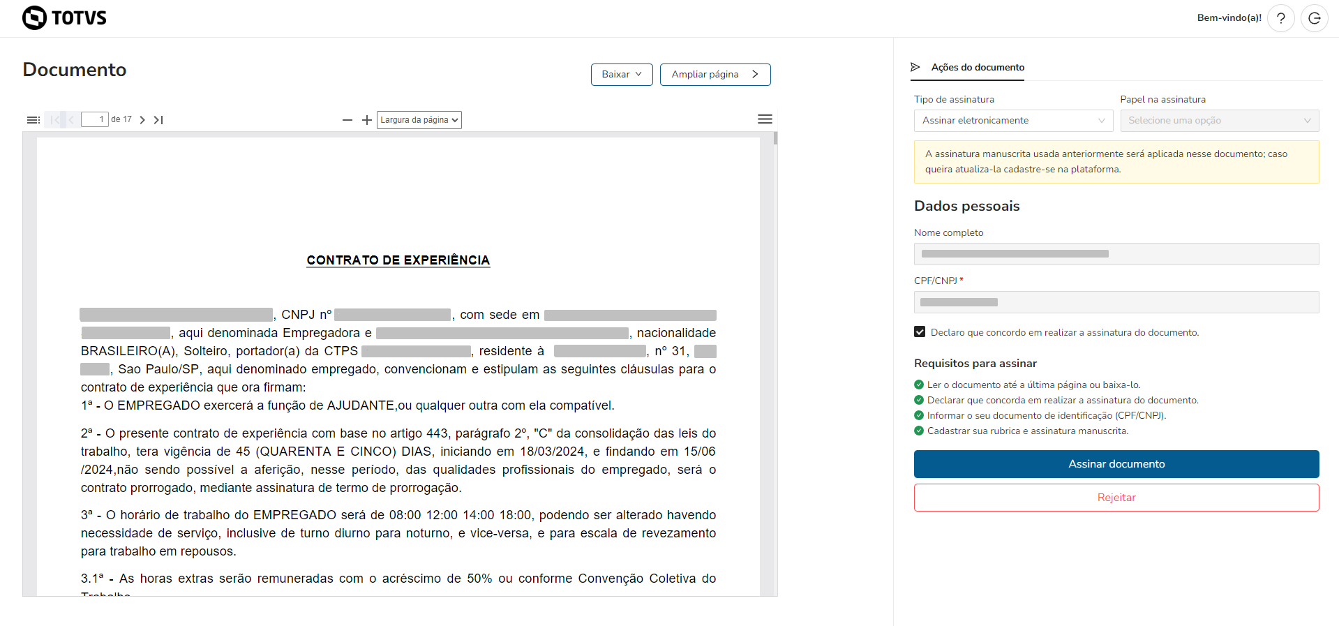 O colaborador receberá um link via e-mail, SMS e whatsapp onde ele pode ler e assinar os documentos.