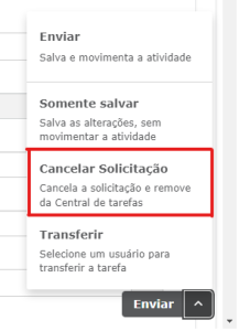 Para cancelar basta acessar o processo desejado, navegar ate o botão do lado inferior direito e clicar em "Cancelar Solicitação"