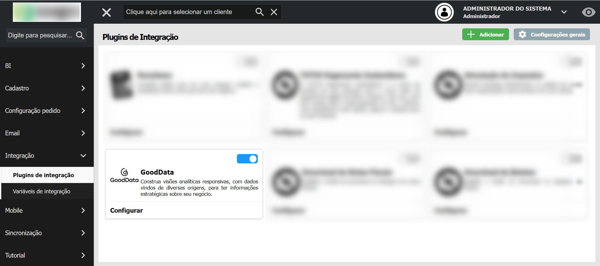 Para utilizar o plugin, acesse a tela da aplicação Web em: Configuração > Integração > Plugins de Integração e Ative o Card referente ao plugin GoodData.