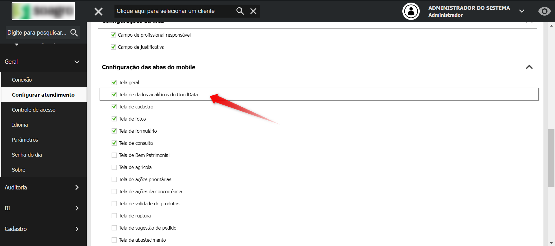 Na lista Configurações das abas do Mobile, marque a caixa de seleção correspondente a "Tela de dados analíticos do GoodData"