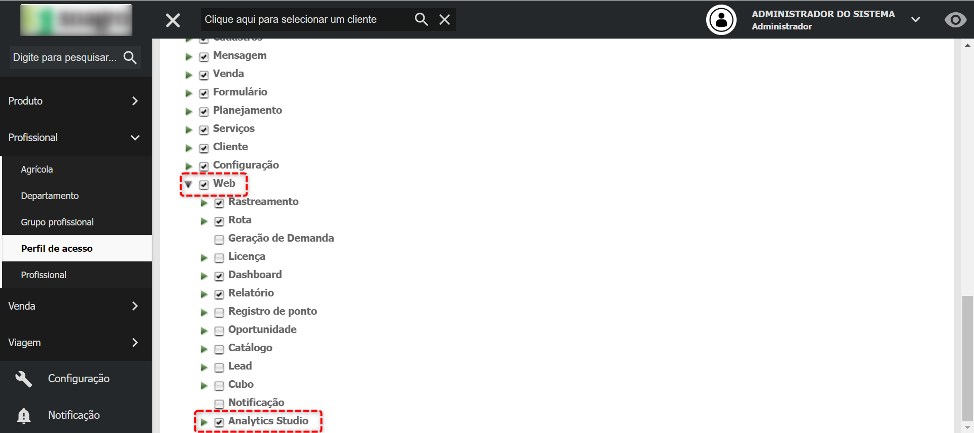 Para que o usuário possa visualizar os Dashboards, o perfil correspondente deve ter acesso ao Módulo "Analytics Studio", configurado em Cadastro > Profissional > Perfil de acesso.