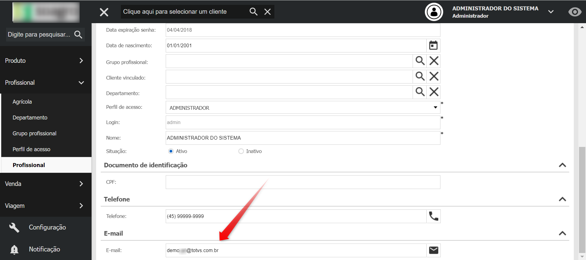 Também para a conexão dos dados do usuário com o GoodData, é necessário que esteja cadastrado corretamente o e-mail padrão no Cadastro do Profissional.