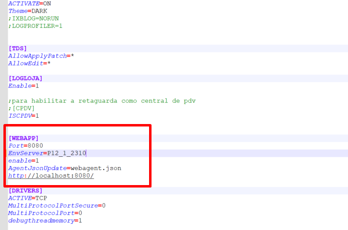 2.2- No Appserver.ini a seção do WebApp tem que estar configurada, para maiores informações sobre essa configuração acessar o link: 2. WebApp - WebAgent