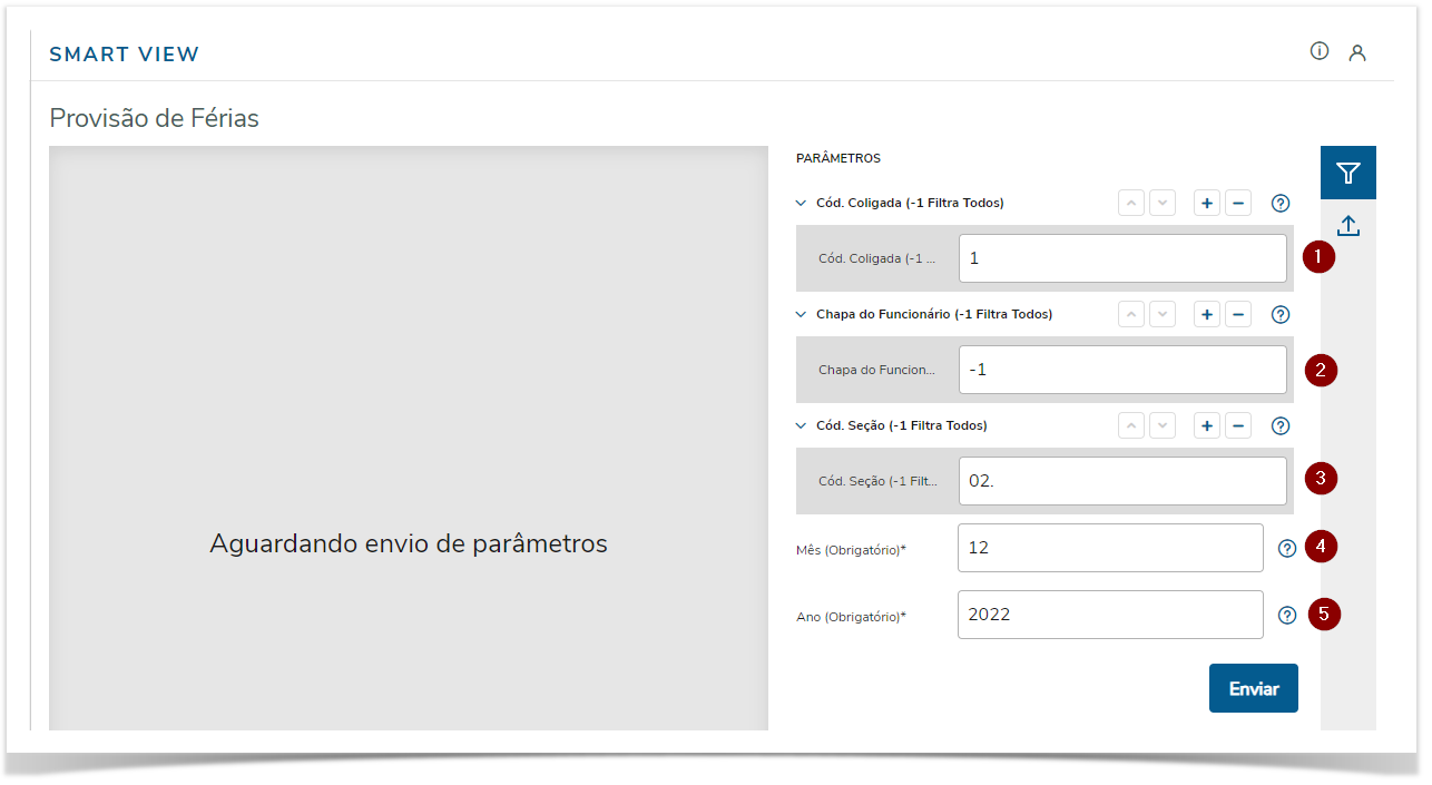 | Ano | Neste campo deverá informar o ano da competência que deseja gerar os dados/relatório de provisão, sendo o mesmo obrigatório, não podendo informar mais de um ano competência e não é aceito informar -1 como os demais parâmetros |