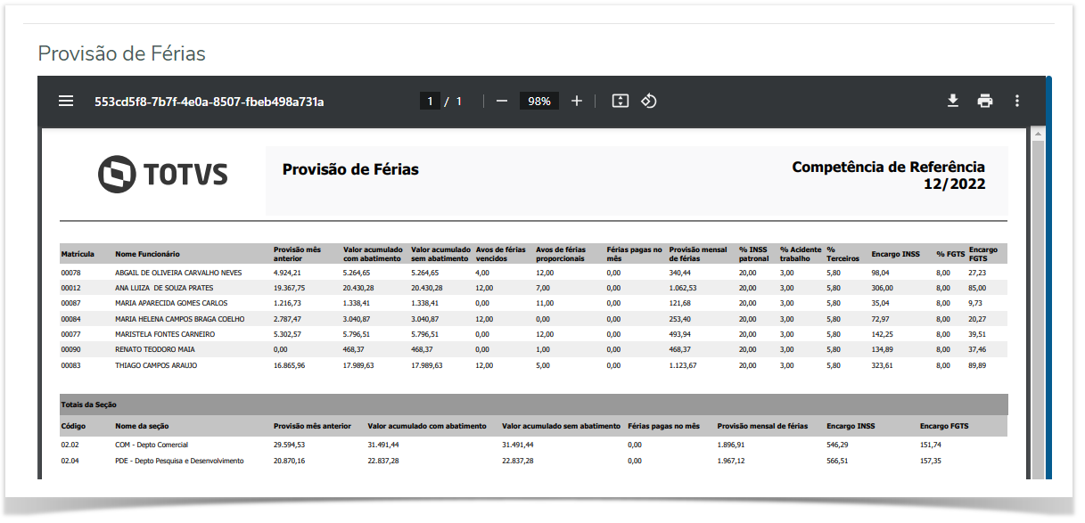 O objeto de negócios e relatório de provisão de férias tem como objetivo entregar para o usuário os valores calculados no processo de provisão e armazenados no histórico de provisão do funcionário, assim como retornar os valores de encargos de INSS e FGTS que serão calculados direito no objeto de negócios e ter em um único local todos os valores, para facilitar a conferência e envio do relatório para as partes interessadas.