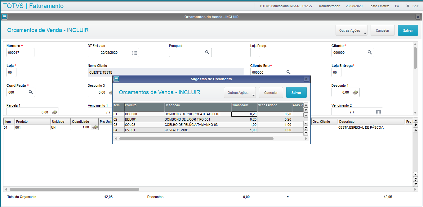 Al informar este producto principal (BG_PRODUTO) en el Presupuesto de venta (MATA415), en el campo "Producto" (CK_PRODUTO), e informar la cantidad (CK_QTDVEN), el sistema indicará el precio sumando los precios de los componentes: