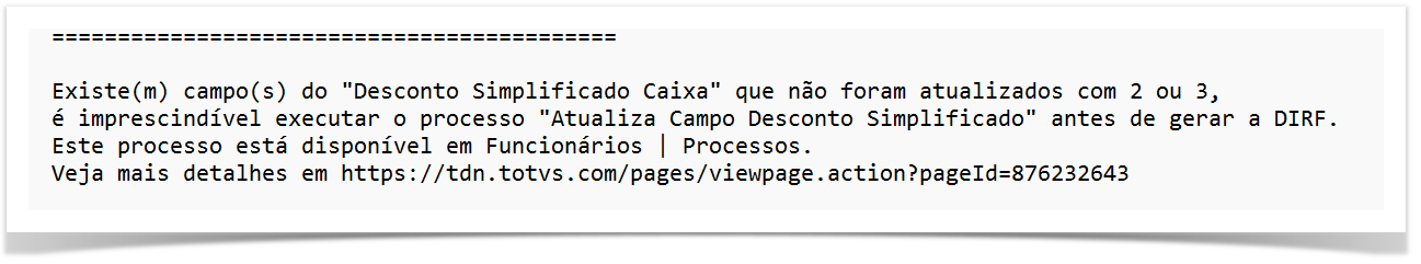 - É imprescindível que, antes de gerar a DIRF 2024/2025, o processo "Atualiza Campo Desconto Simplificado" seja executado para garantir a conformidade necessária à geração da declaração.