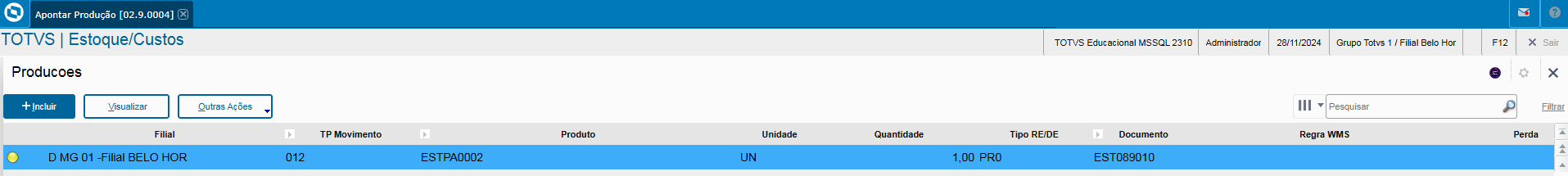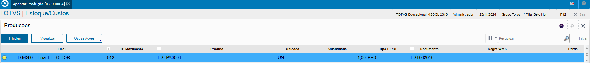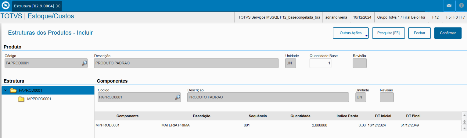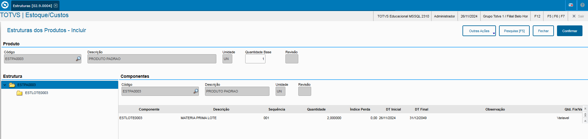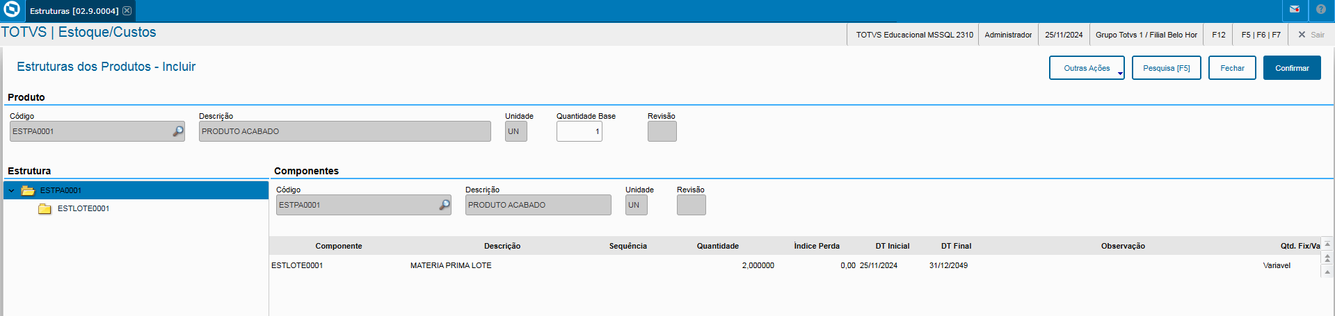 Durante o exemplo descrito neste passo a passo, foi criado o produto "ESTLOTE0002" que é matéria prima para a produção do produto "ESTPA0002":