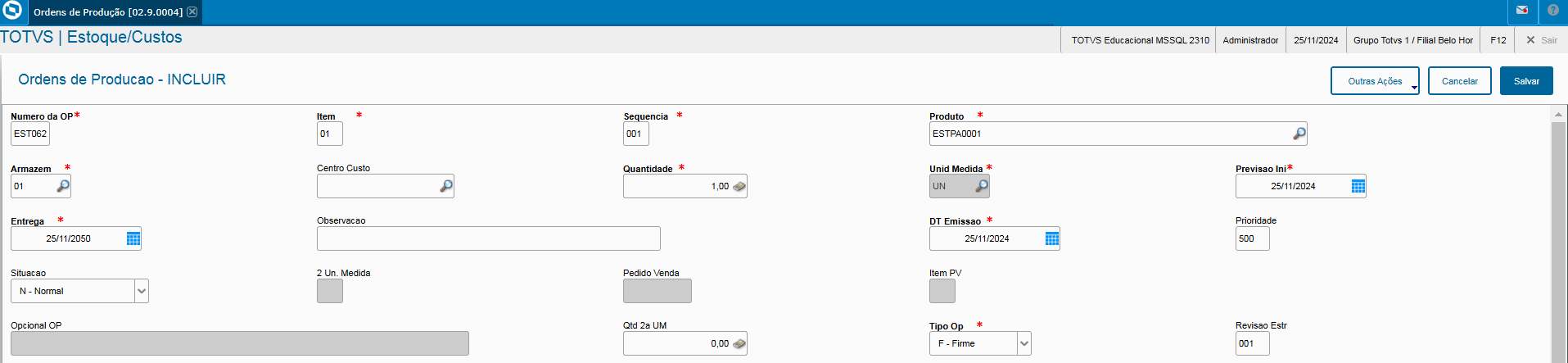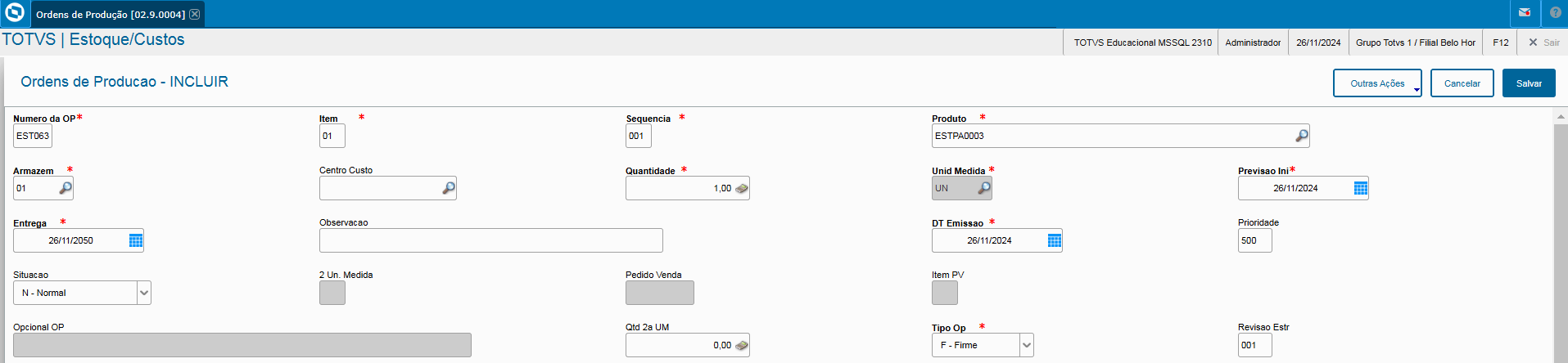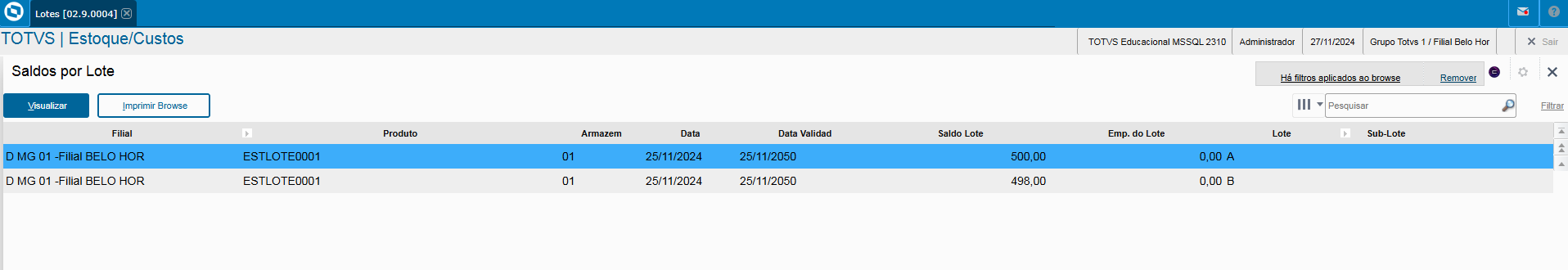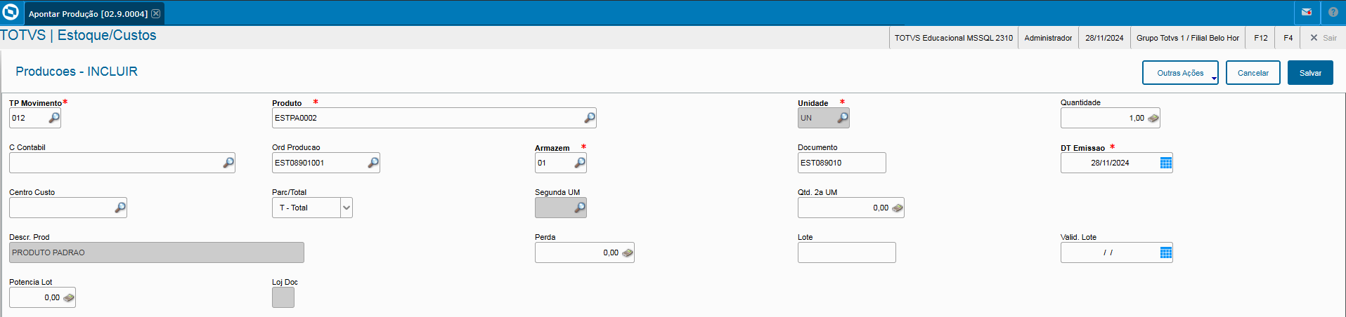 Durante o exemplo descrito neste passo a passo, foi criado o produto "ESTLOTE0002" que é matéria prima para a produção do produto "ESTPA0002":