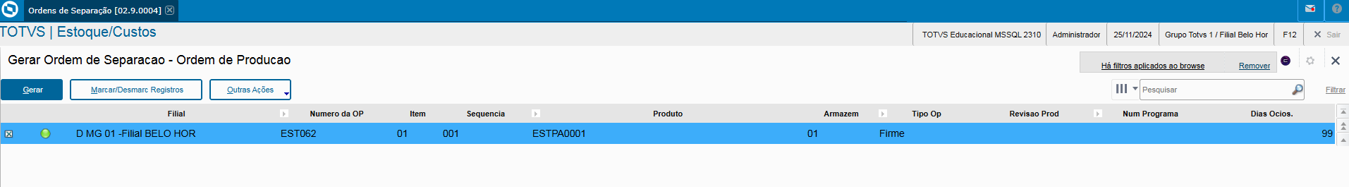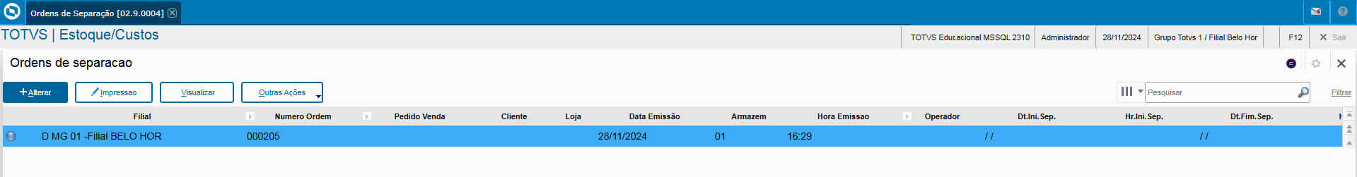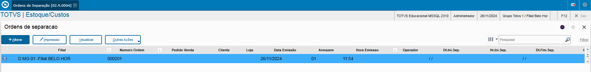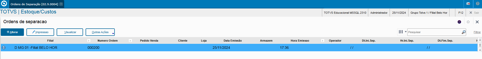 A rotina Ordem de Separação(ACDA100) tem o objetivo de separar os produtos originados da ordem de separação para: Pedido de Venda, Nota Fiscal de Saída ou Ordem de Produção.
