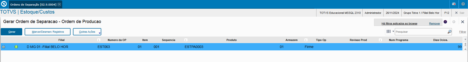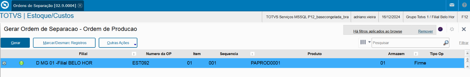 Neste exemplo vamos gerar uma Ordem de Separação para uma Ordem de Produção, porém a matéria prima ainda não possui Requisições Empenhadas(SD4).