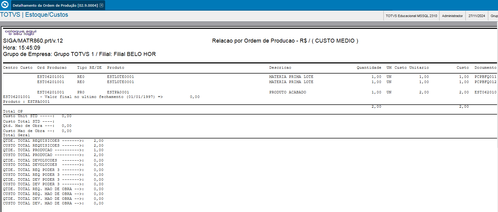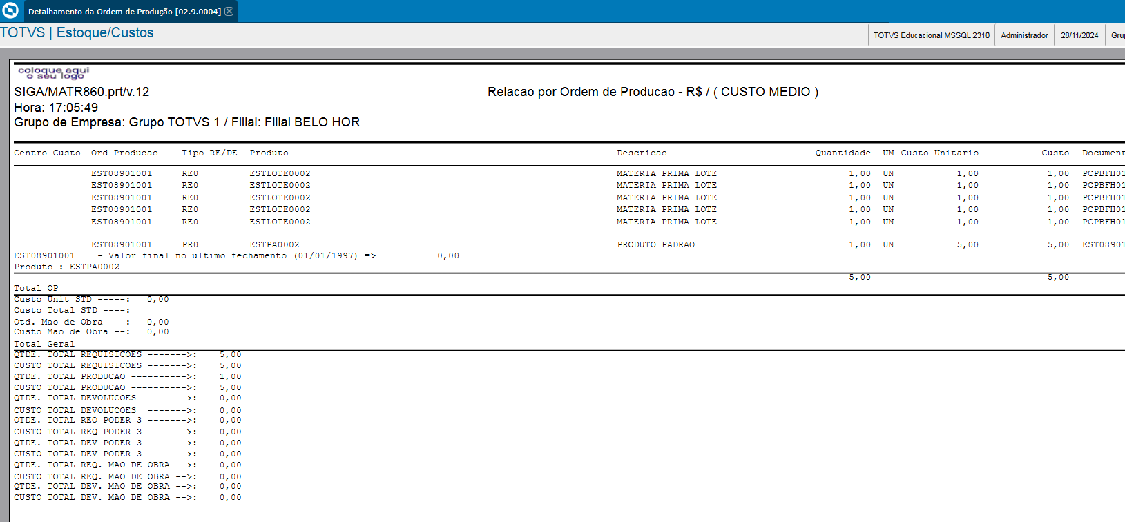 Resultado: A Ordem de Produção teve o produto acabado "ESTPA0002" produzido e foi consumido a quantidade de cinco matérias prima do produto "ESTLOTE0002":