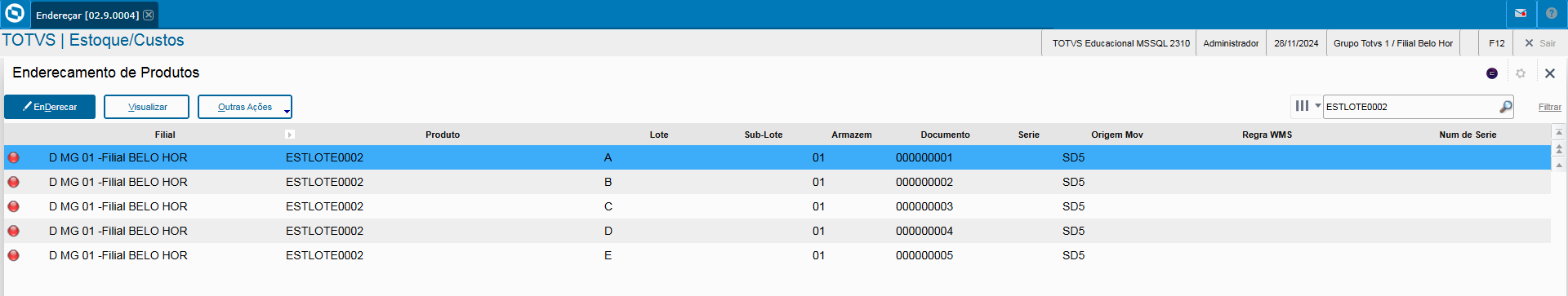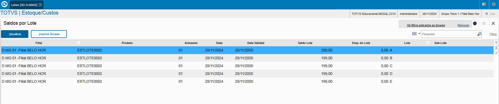 Após a troca para o lote "E" o saldo pendente a separar(2) foi transferido para o lote "E", o lote "D" foi atualizado para o saldo de 1, pois realmente foi separado apenas um para este lote, e a linha anterior do lote "D" foi excluída, pois o saldo agora foi dividido entre os lotes B, C, D e E: