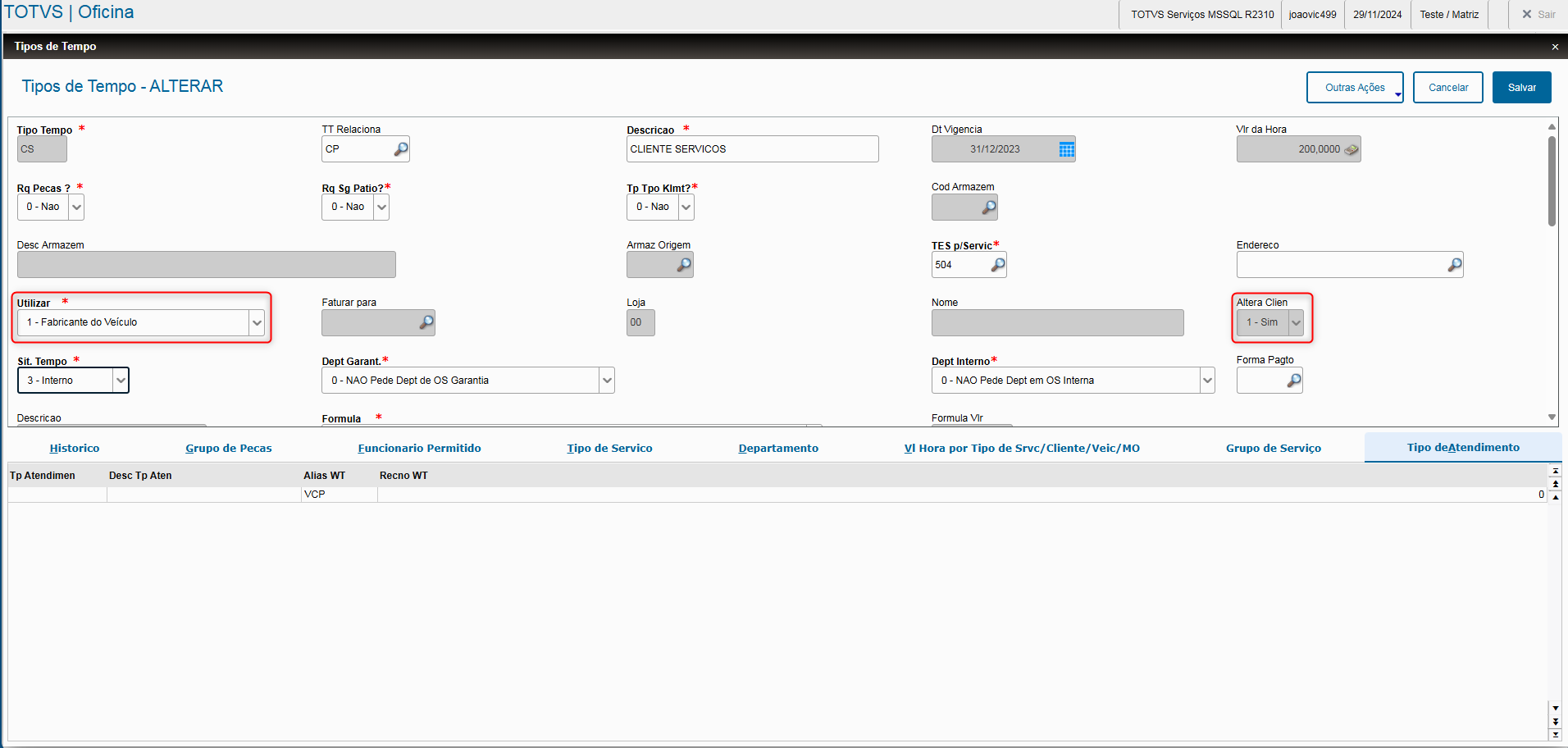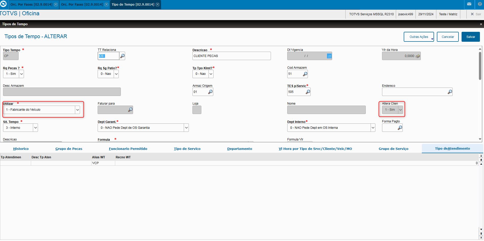 - Selecione os Tipos de Tempo que os campos estejam definidos como "Altera Cliente (VOI_ALTCLI = 1 - Sim)" e "Utilizar (VOI_USAPRO = 1 - Fabricante)".