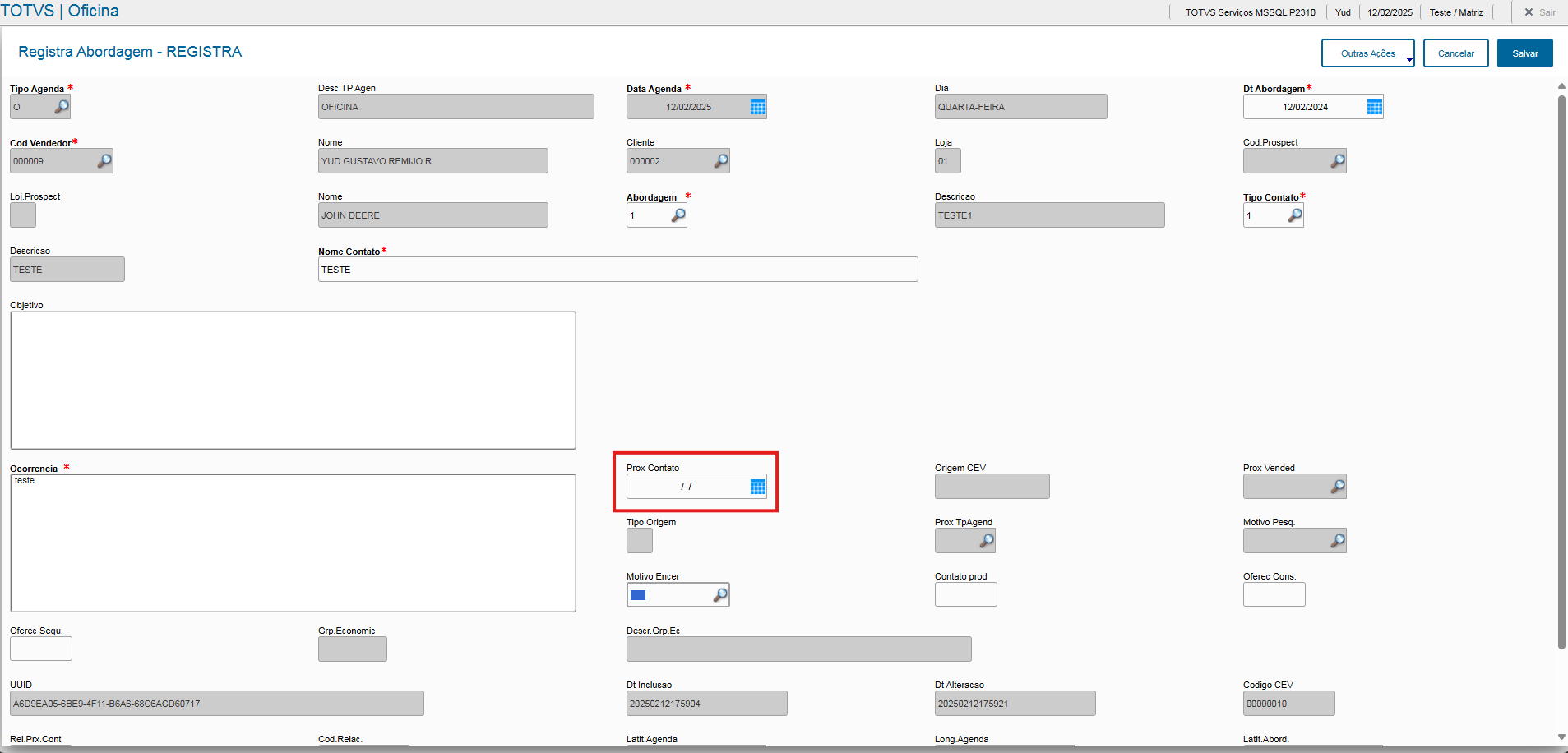 • Veja que o campo "Prox Contato" não está como obrigatoriedade de preenchimento.