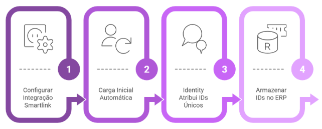 Na carga inicial, assim que o ERP estabelece comunicação com o Smartlink, todos os usuários ativos do ambiente são enviados automaticamente para o Identity.
