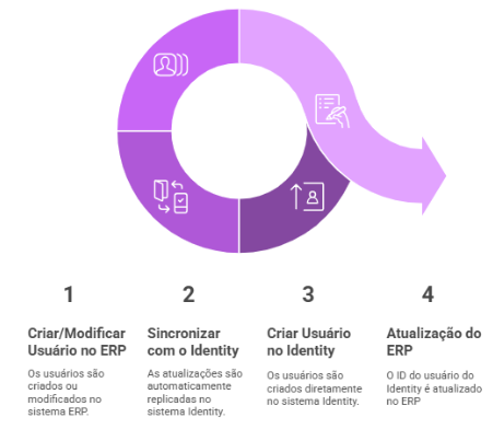 No sentido contrário, ou seja, de usuários criados diretamente no Identity para o ERP, esse usuário não será criado de maneira automática no ERP.