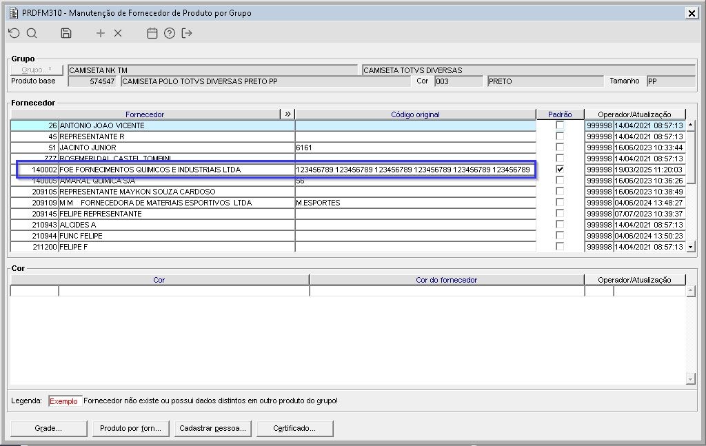 Imagem 01 - O código de fornecedor impresso no relatório CMPR020 é obtido na coluna "Código original" do PRDFM310.