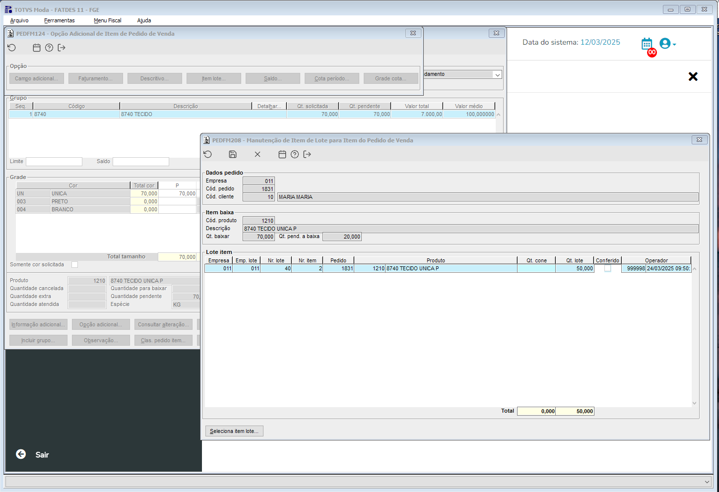 Imagem 2 - Lote alocado ao pedido pelo PEDFP156.