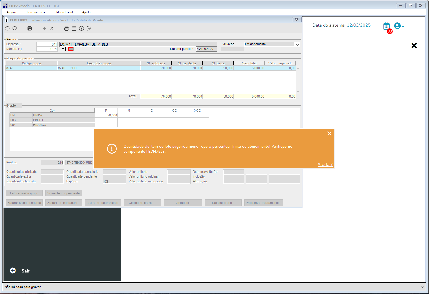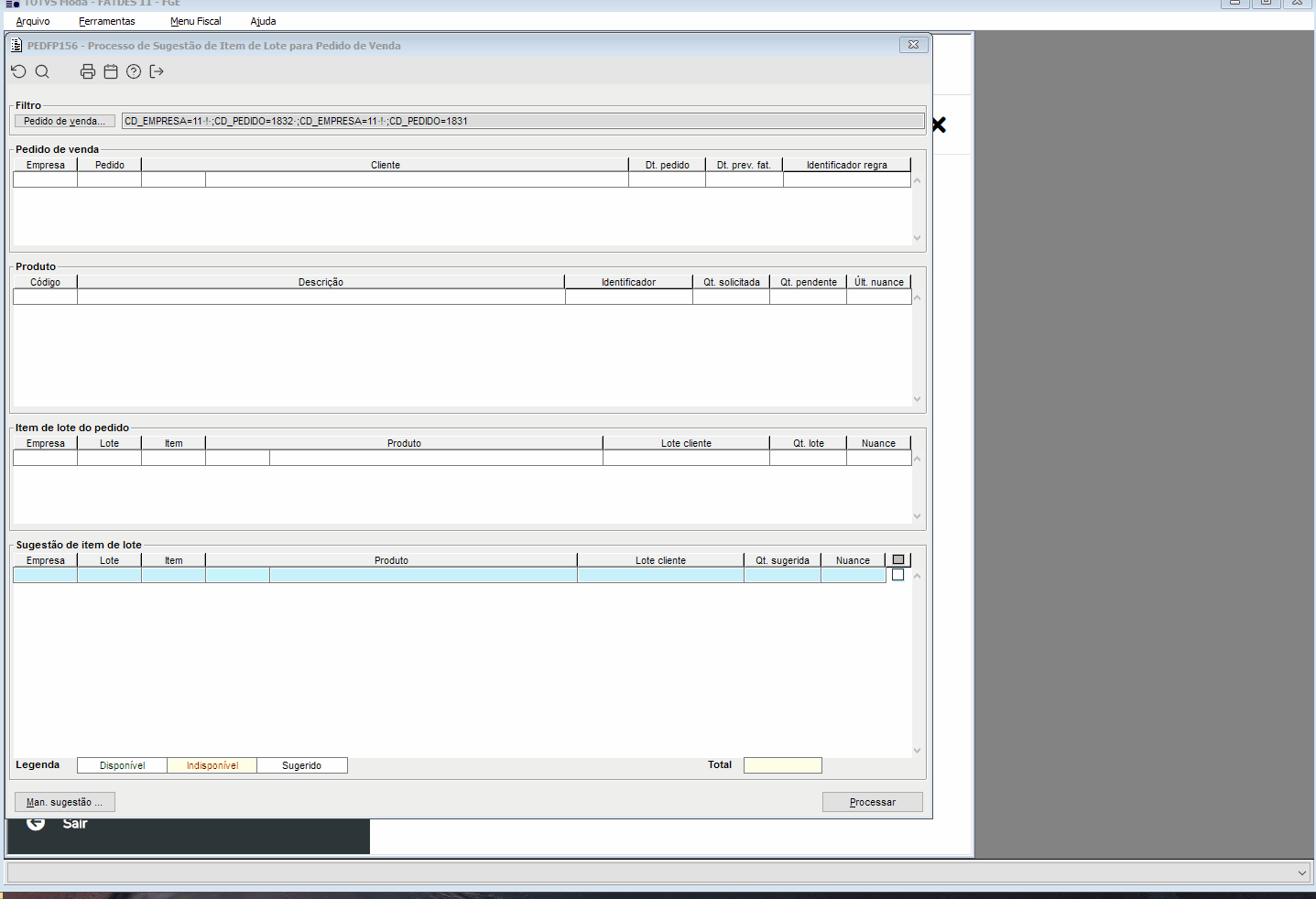 Foi ajustada a lógica do processo de sugestão para que permita sugerir fora dos ranges configurados no PEDFM253, a listagem do item de lote com quantidades inferiores ao mínimo ou máximo permitidos ao pedido. E foi validado na baixa do pedido o bloqueio quando o item está fora dos ranges.