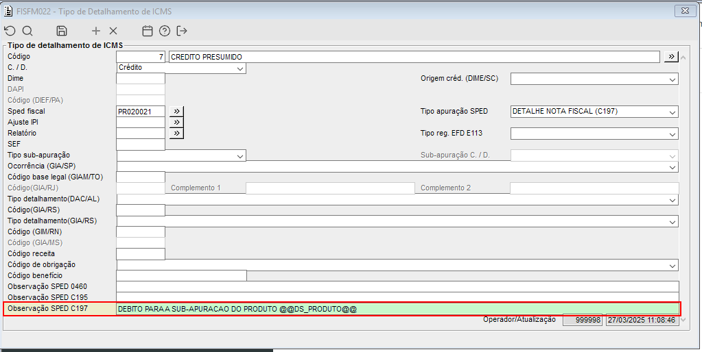 Imagem 3.01 - Configurado no tipo de detalhamento de ICMS, para usar o @@DS_PRODUTO@@ junto a descrição no campo Observação SPED C197.