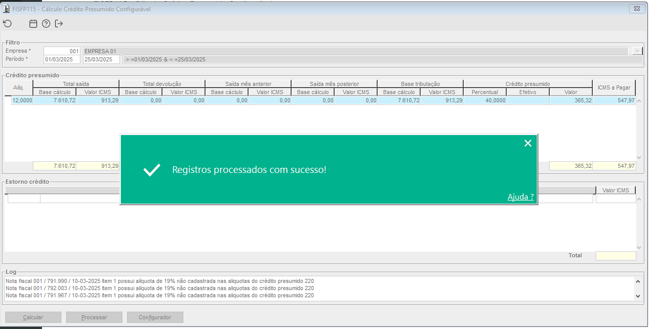 Imagem 3.03 - Realizado o processo do cálculo do crédito presumido, que utilizou a configuração anterior.
