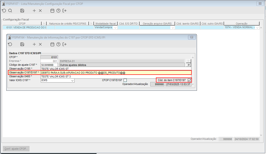 Imagem 3.05 - Na tela do FISFM107, através do botão Conf. ajuste CFOP é chamado o FISFM164, onde foi inclusão no campo Observação C197/D197 o texto composto que utiliza do @@DS_PRODUTO@@.