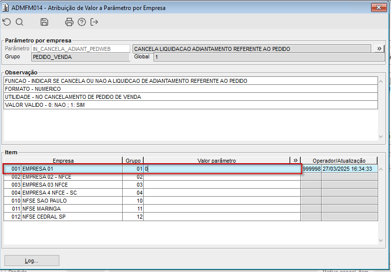 Imagem 1 - Parâmetro empresa IN_CANCELA_ADIANT_PEDWEB configurado com valor zero, para não cancelar.