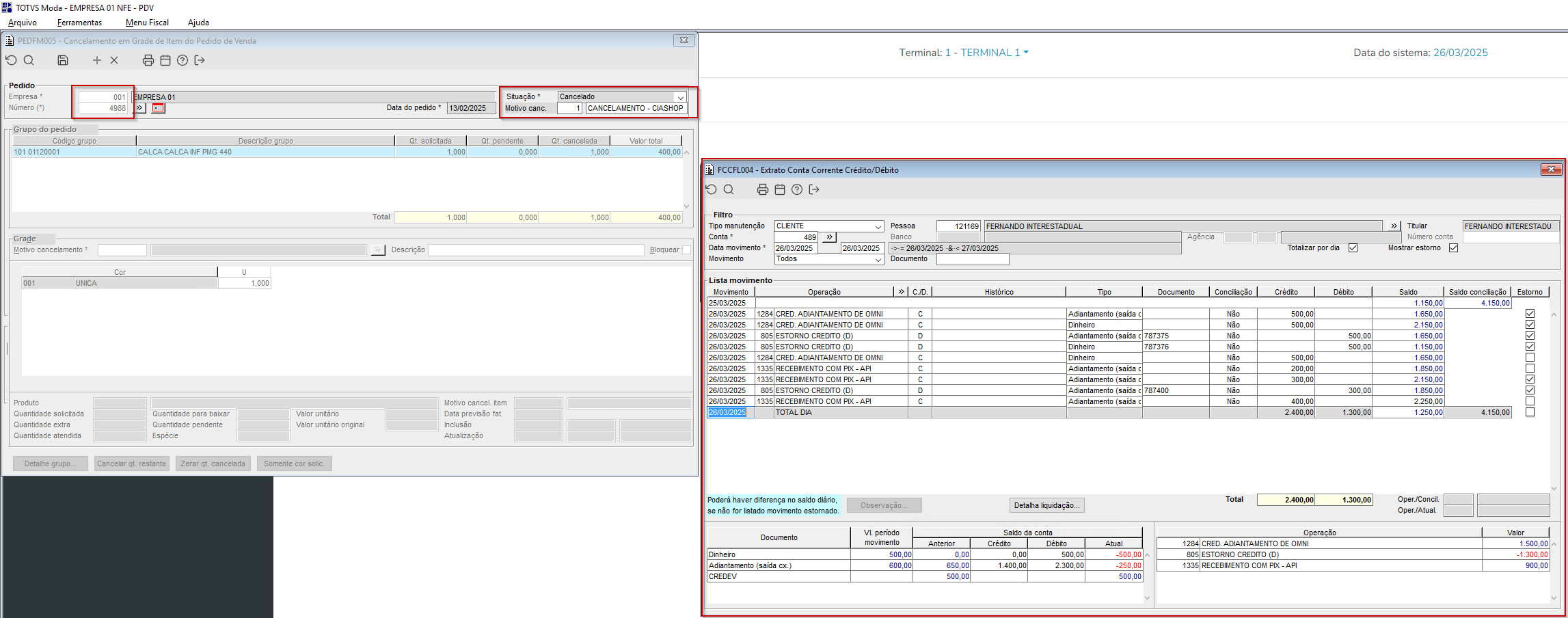 Imagem 3 - Pedido cancelado e adiantamento não estornado.