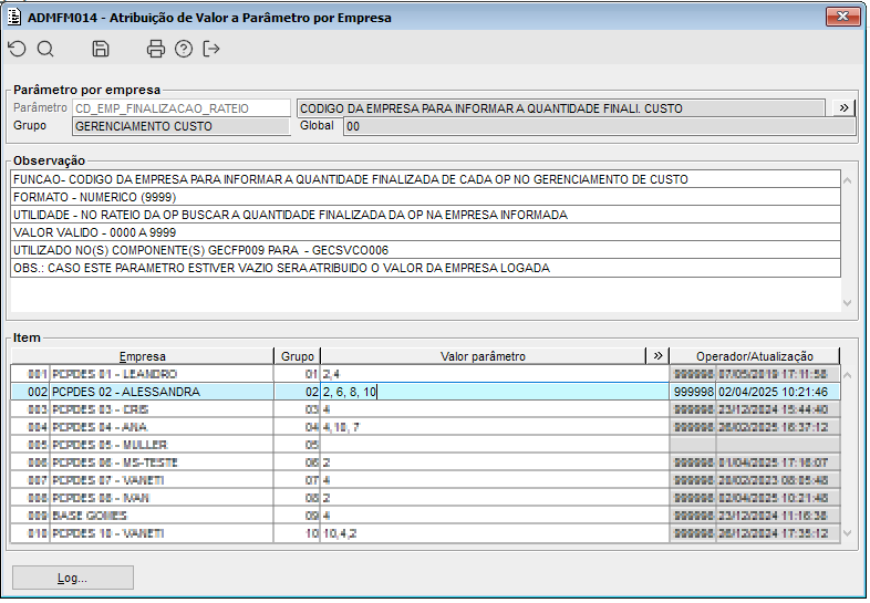 Imagem 1 - Parâmetro "CD_EMP_FINALIZACAO_RATEIO" com empresas destino de duplicação informadas.