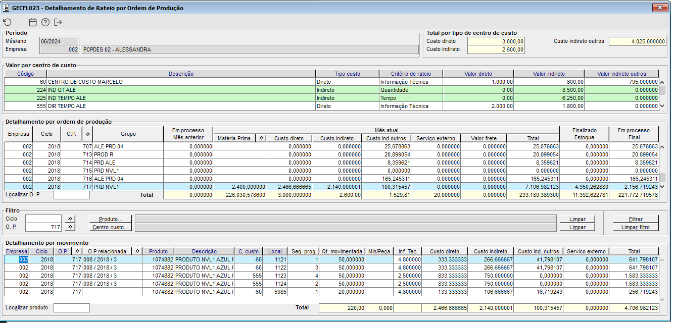 Imagem 5 - No componente GECFL023, os totais do frame "Detalhamento por ordem de produção" estão consistentes com o total de custo direto e indireto listado no total por tipo de centro de custo.
