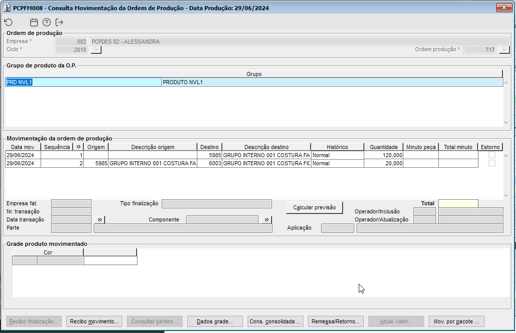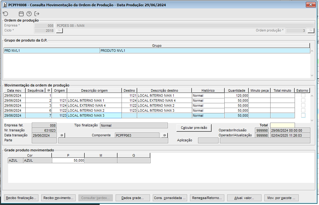 Imagem 3 - Ordem de produção 717 com movimento realizado na empresa origem.