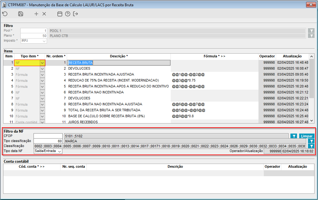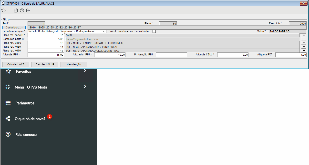 | Função: | CTPFM087 - Manutenção da Base de Cálculo LALUR/LACS por Receita Bruta |