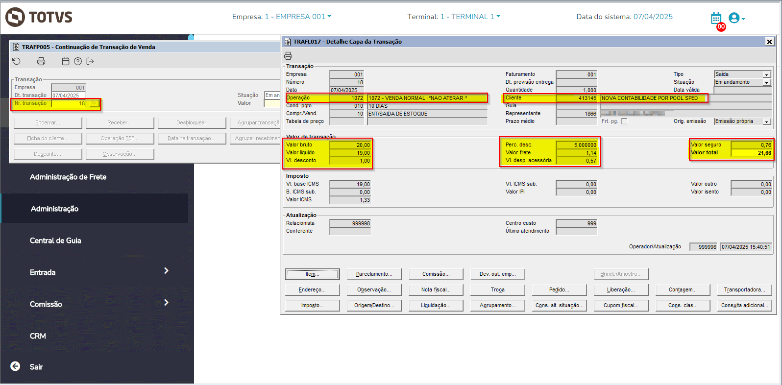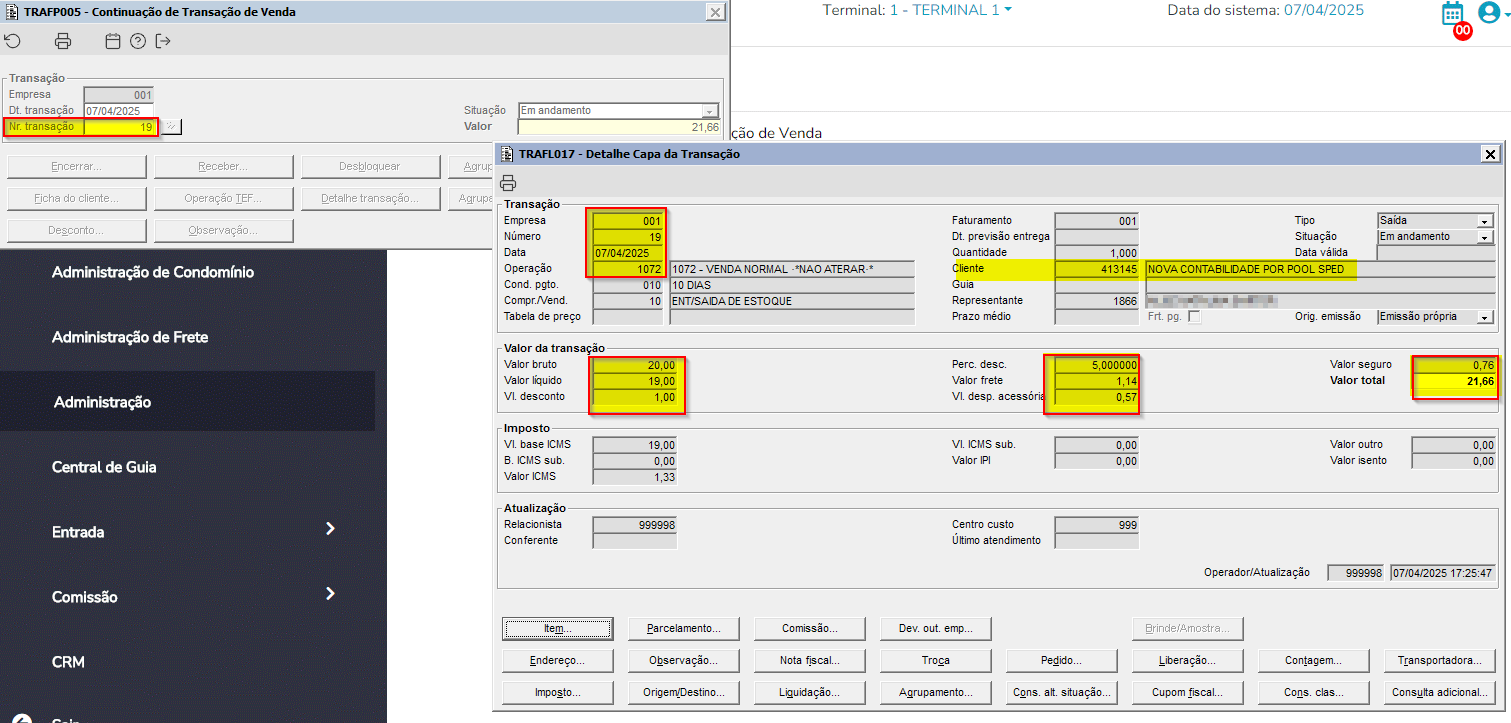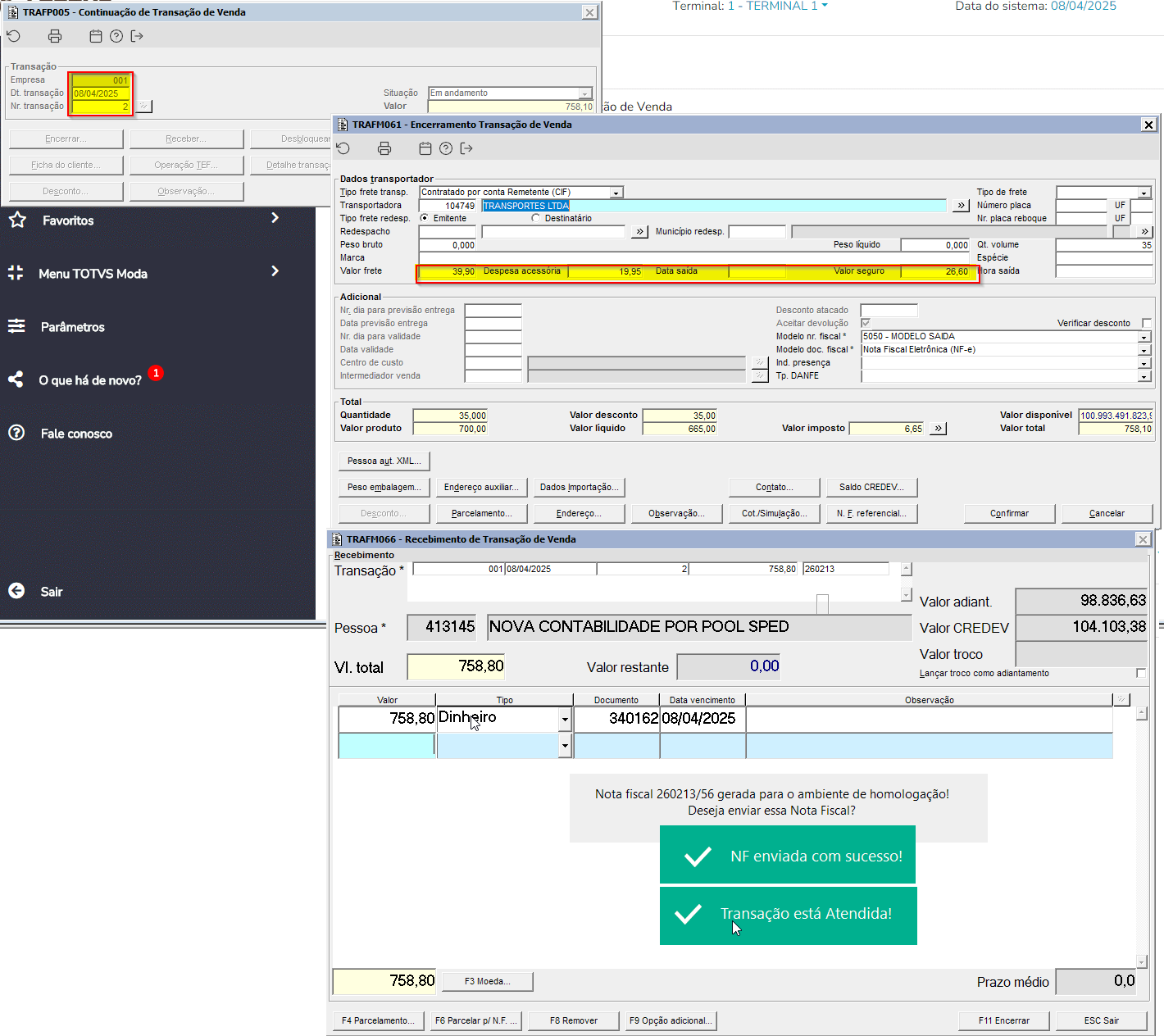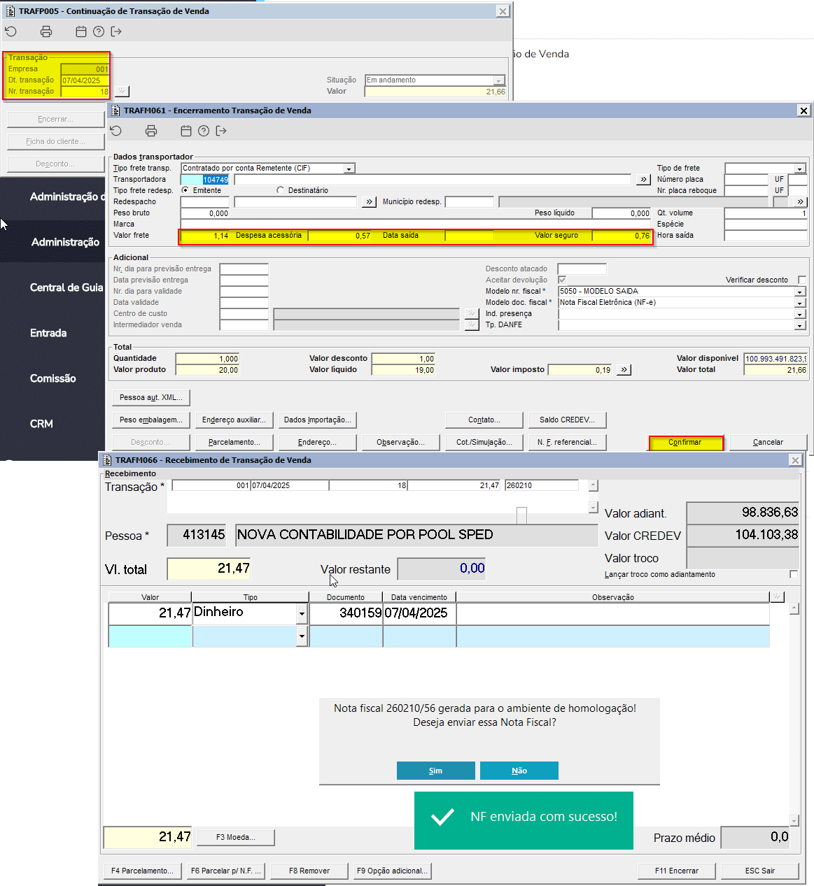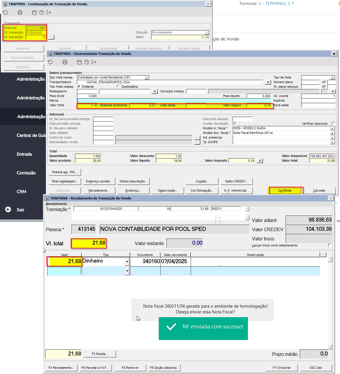 Imagem 04 - Demonstração no de Continuação de Transação de Venda, com o encerramento da venda no TRAFM061 e com o recebimento no TRAFM066 utilizando o parâmetro IN_RECALCULA_VLPRD_NF = 1.