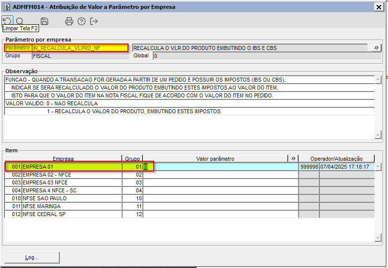 Imagem 06 - Demonstração no ADMFM014 de Atribuição de Valor a Parâmetro por Empresa, para o parâmetro IN_RECALCULA_VLPRD_NF = 0.