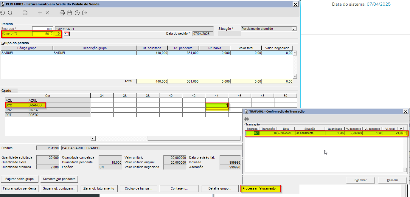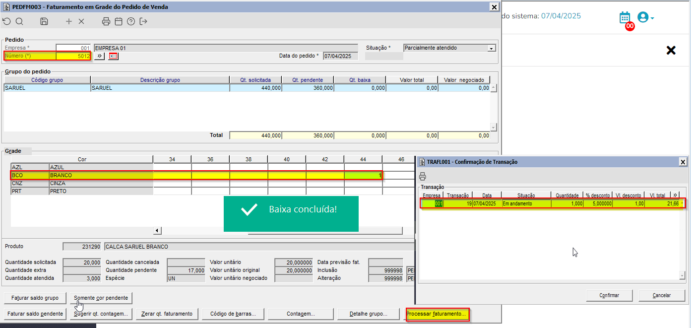 Imagem 02 - Demonstração no PEDFM003 de Faturamento em Grade de Pedido de Venda, para o pedido = 5012, produto em grade = "BCO BRANCO numero 44 com 01 de quantidade no valor de 21,66 na confirmação da Transação.