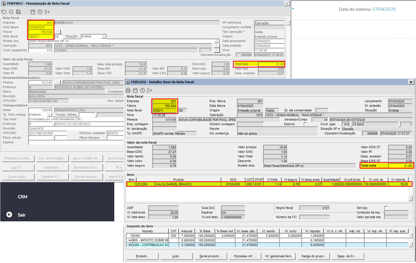 Imagem 05 - Demonstração no FISFL032 de Detalhe Item da Nota Fiscal, para NF 260210 com o valor total da nota de 21,47 utilizando o parâmetro IN_RECALCULA_VLPRD_NF = 1.